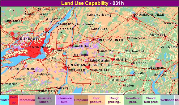 The Canada Land Inventory provides one of the most comperhensive digital map sources for resource planning ad management in Canada. The area covered by the CLI is indicated in the index map. For each of the map sheets areas land capability is mapped at 1:250'000 scale and usually at a 1:50'000 scale. This is an example for Mapsheet 31 H, Montreal. The index map on the right shows the areas mapped for land capability under the CLI. The left image shows an example of a number of overlays displayed on Google Earth.