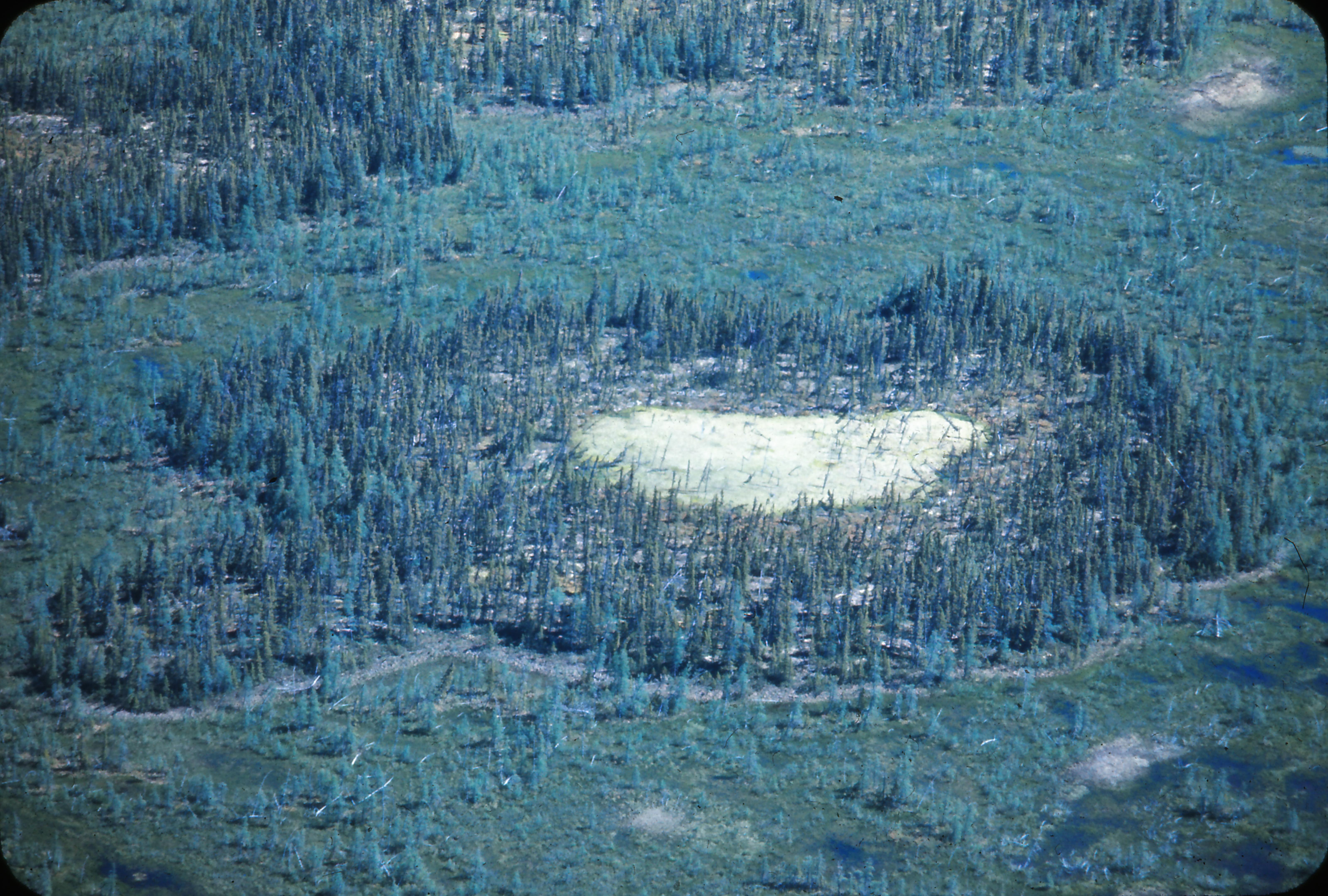 A typical example of the type of permafrost landforms in wetlands is provided by the photograph below taken from a Beaver aircraft in 1972. Area A shows a collapse scar where permafrost has melted. The small black spruce trees are slowly being submersed in the waterlogged scar. The area around B is typical of the non-frozen wetland. Sparse growth of Tamarack (Larix Laricina)-light green tree- can be seen here in a poorly developed ribbed fen. Drainage is from right to left. Around D is a typical growth of stunted Black Spruce (Picea Mariana) can be seen. Light coloured ground cover between the spruce is a combination of lichen and mosses.