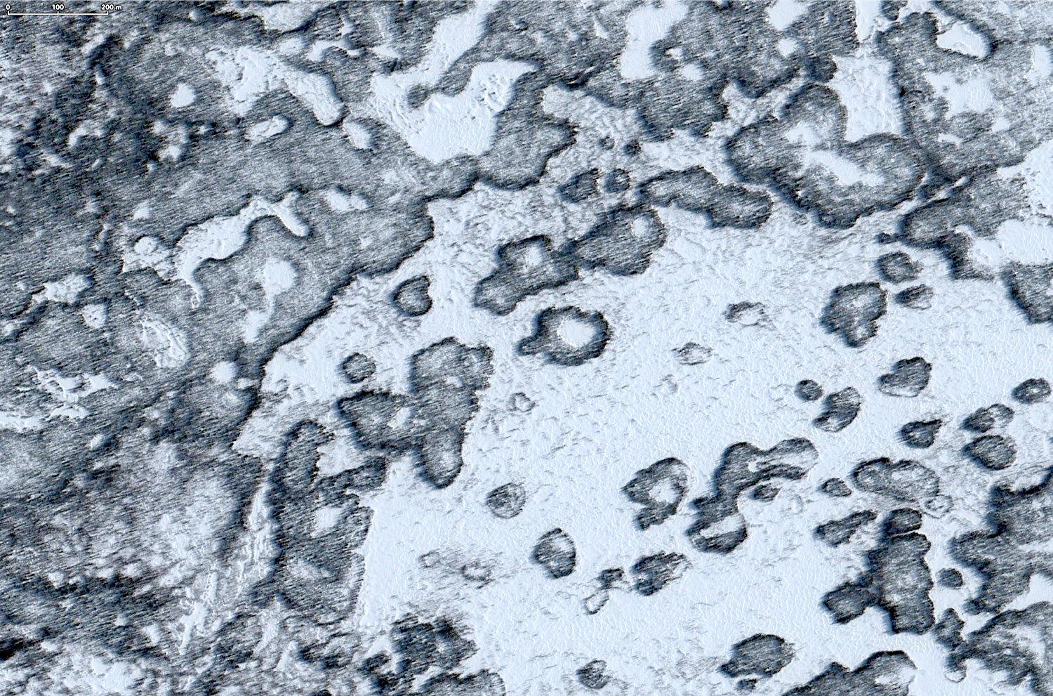 This figure shows a time interval of 10 years. The right image was taken on 2003-08-27, the left one on 2013-09-13. Together they form a stereopair which can be sudied in 3 d with a stereoscope. While the distinct impression exsist that the melting scar has increased, it seems impossible to measure using these two images. The steromodel shows changes but tree shadows and surface water (2003) make it difficult to compare actual edges. Using the melting rate estabished by comparison of the 1930 and 2013 images above, the edges should have receded by 2.5-3 meters over this 10 year period.