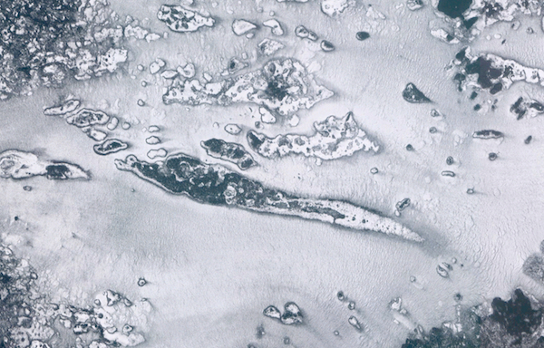 PHOTO 8: Most recent Apple Maps Image- winter. This selection is comparable to photo 7 above. The snow cover enhances the difference between the denser Black Spruce on permafrost and non frozen areas. It is clear that melting has continued since 1984, but not in a dramatic way.